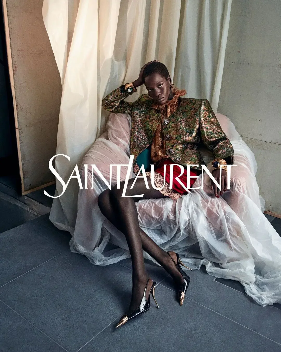 Saint Laurent’s Spring/Summer 2025 campaign, captured by Glen Luchford, exudes quiet cinematic intensity. Featuring Anok Yai, Penelope Ternes, Ella Mccutcheon, and Justino Gonzalez, the imagery emphasizes poised stillness in dark, intimate interiors, evoking fragments of an unmade film. Creative director Anthony Vaccarello’s vision comes alive through subtlety: velvet, satin, and lacquered surfaces frame elongated silhouettes, and the chosen settings function almost as characters themselves, shaping narrative alongside the models. Every fold of fabric, trace of light, and even bare feet feels deliberate, underscoring Saint Laurent’s mastery of measured elegance and evocative storytelling.