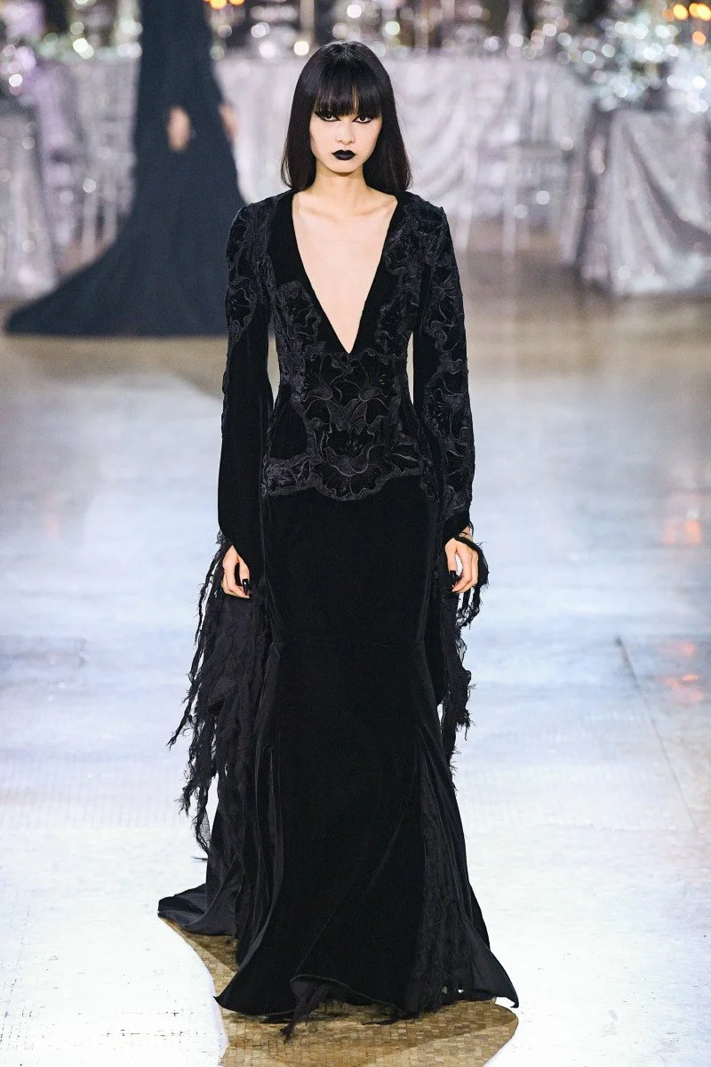 Dark romantic fashion has seen a discernible comeback as movies like Nosferatu, Frankenstein, and The Bride become contemporary gothic fantasy classics. These movies reintroduced viewers to eerily lovely aesthetics, such as dramatic shapes, dark color schemes, and emotionally driven narratives, all of which have had a growing impact on modern fashion design. The visual worlds created in these films emphasize elements traditionally associated with gothic romance: flowing garments, intricate lace, high collars, corsetry, and deep, moody tones such as black, burgundy, and midnight blue. These cinematic nuances have served as inspiration for designers, who have incorporated them into runway collections that combine contemporary shapes with historical allusions. The end product is attire that echoes the uncanny elegance and emotional intensity exhibited on film, seeming both theatrical and wearable. In other collections, a more somber, romantic style also surfaced. Designers employed rich jewel tones, dramatic silhouettes, and elaborate embellishments like lace, ruffles, and embroidery, all of which were influenced by medieval and gothic aspects. Richard Quinn and Erdem used dramatic patterns and intricately patterned textiles to embrace this vibe.